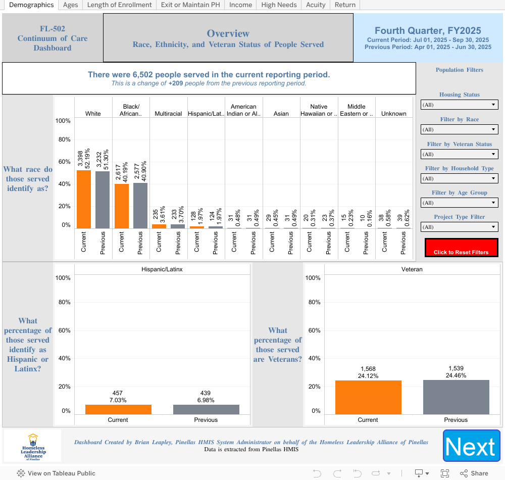 If you have questions about the data contained in the dashboard, please contact the Pinellas HMIS Help Desk for more information. Email: support@pinellashmis.zendesk.com